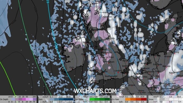 Upcoming forecasts suggest that Thursday will witness some of the heaviest snowfall experienced by many Britons this year. WXCharts’ latest maps depict purple patches indicating snow showers developing along the coast from Wednesday evening, with the most intense snowfall anticipated off the northeast and southwest shores. Areas like Wales and Plymouth might experience snowfall rates of up to 15mm per hour, with even higher levels north of the border.