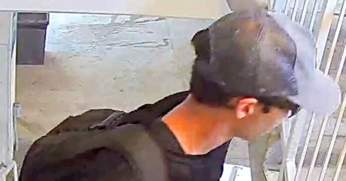 Surveillance footage shows the suspect in a stairwell wearing a black long-sleeved t-shirt with an American flag design, blue pants, and Converse-style shoes. He attempts to conceal his face with a cap and sunglasses while carrying a full backpack.